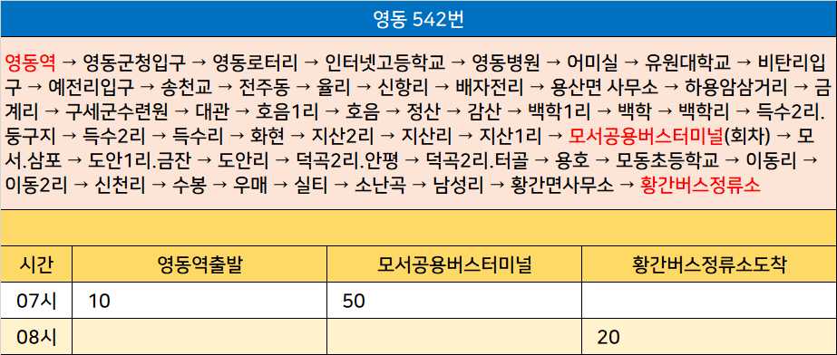 영동 542번: 영동역 → 영동군청입구 → 영동로터리 → 인터넷고등학교 → 영동병원 → 어미실 → 유원대학교 → 비탄리입구 → 예전리입구 → 송천교 → 전주동 → 율리 → 신항리 → 배자전리 → 용산면 사무소 → 하용암삼거리 → 금계리 → 구세군수련원 → 대관 → 호음1리 → 호음 → 정산 → 감산 → 백학1리 → 백학 → 백학리 → 득수2리.둥구지 → 득수2리 → 득수리 → 화현 → 지산2리 → 지산리 → 지산1리 → 모서공용버스터미널(회차) → 모서.삼포 → 도안1리.금잔 → 도안리 → 덕곡2리.안평 → 덕곡2리.터골 → 용호 → 모동초등학교 → 이동리 → 이동2리 → 신천리 → 수봉 → 우매 → 실티 → 소난곡 → 남성리 → 황간면사무소 → 황간버스정류소