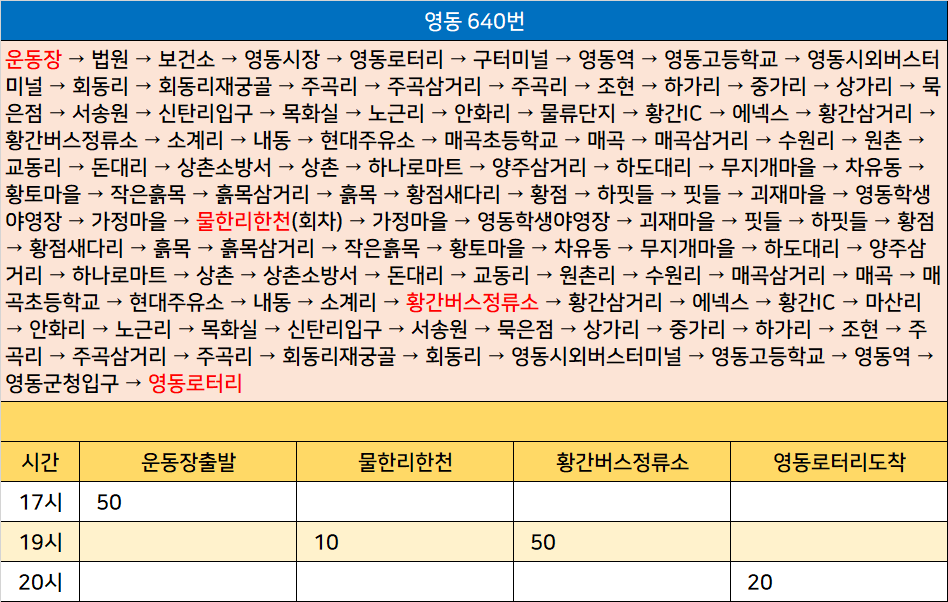 영동 640번: 운동장 → 법원 → 보건소 → 영동시장 → 영동로터리 → 구터미널 → 영동역 → 영동고등학교 → 영동시외버스터미널 → 회동리 → 회동리재궁골 → 주곡리 → 주곡삼거리 → 주곡리 → 조현 → 하가리 → 중가리 → 상가리 → 묵은점 → 서송원 → 신탄리입구 → 목화실 → 노근리 → 안화리 → 물류단지 → 황간IC → 에넥스 → 황간삼거리 → 황간버스정류소 → 소계리 → 내동 → 현대주유소 → 매곡초등학교 → 매곡 → 매곡삼거리 → 수원리 → 원촌 → 교동리 → 돈대리 → 상촌소방서 → 상촌 → 하나로마트 → 양주삼거리 → 하도대리 → 무지개마을 → 차유동 → 황토마을 → 작은흙목 → 흙목삼거리 → 흙목 → 황점새다리 → 황점 → 하핏들 → 핏들 → 괴재마을 → 영동학생야영장 → 가정마을 → 물한리한천(회차) → 가정마을 → 영동학생야영장 → 괴재마을 → 핏들 → 하핏들 → 황점 → 황점새다리 → 흙목 → 흙목삼거리 → 작은흙목 → 황토마을 → 차유동 → 무지개마을 → 하도대리 → 양주삼거리 → 하나로마트 → 상촌 → 상촌소방서 → 돈대리 → 교동리 → 원촌리 → 수원리 → 매곡삼거리 → 매곡 → 매곡초등학교 → 현대주유소 → 내동 → 소계리 → 황간버스정류소 → 황간삼거리 → 에넥스 → 황간IC → 마산리 → 안화리 → 노근리 → 목화실 → 신탄리입구 → 서송원 → 묵은점 → 상가리 → 중가리 → 하가리 → 조현 → 주곡리 → 주곡삼거리 → 주곡리 → 회동리재궁골 → 회동리 → 영동시외버스터미널 → 영동고등학교 → 영동역 → 영동군청입구 → 영동로터리