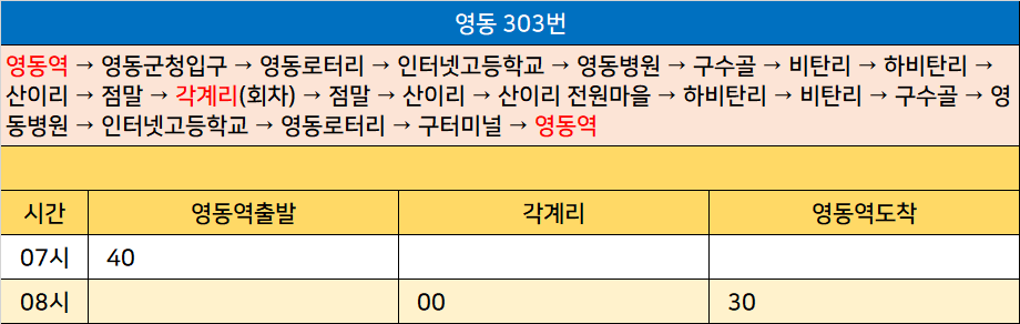 영동 303번: 영동역 → 영동군청입구 → 영동로터리 → 인터넷고등학교 → 영동병원 → 구수골 → 비탄리 → 하비탄리 → 산이리 → 점말 → 각계리(회차) → 점말 → 산이리 → 산이리 전원마을 → 하비탄리 → 비탄리 → 구수골 → 영동병원 → 인터넷고등학교 → 영동로터리 → 구터미널 → 영동역