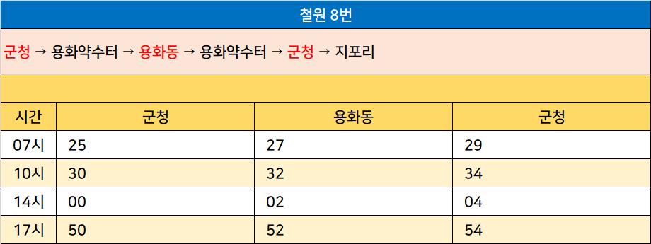 철원 8번: 군청 → 용화약수터 → 용화동 → 용화약수터 → 군청 → 지포리