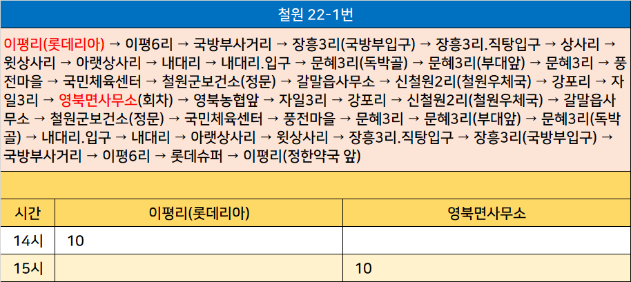 철원 22-1번: 이평리(롯데리아) → 이평6리 → 국방부사거리 → 장흥3리(국방부입구) → 장흥3리.직탕입구 → 상사리 → 윗상사리 → 아랫상사리 → 내대리 → 내대리.입구 → 문혜3리(독박골) → 문혜3리(부대앞) → 문혜3리 → 풍전마을 → 국민체육센터 → 철원군보건소(정문) → 갈말읍사무소 → 신철원2리(철원우체국) → 강포리 → 자일3리 → 영북면사무소(회차) → 영북농협앞 → 자일3리 → 강포리 → 신철원2리(철원우체국) → 갈말읍사무소 → 철원군보건소(정문) → 국민체육센터 → 풍전마을 → 문혜3리 → 문혜3리(부대앞) → 문혜3리(독박골) → 내대리.입구 → 내대리 → 아랫상사리 → 윗상사리 → 장흥3리.직탕입구 → 장흥3리(국방부입구) → 국방부사거리 → 이평6리 → 롯데슈퍼 → 이평리(정한약국 앞)