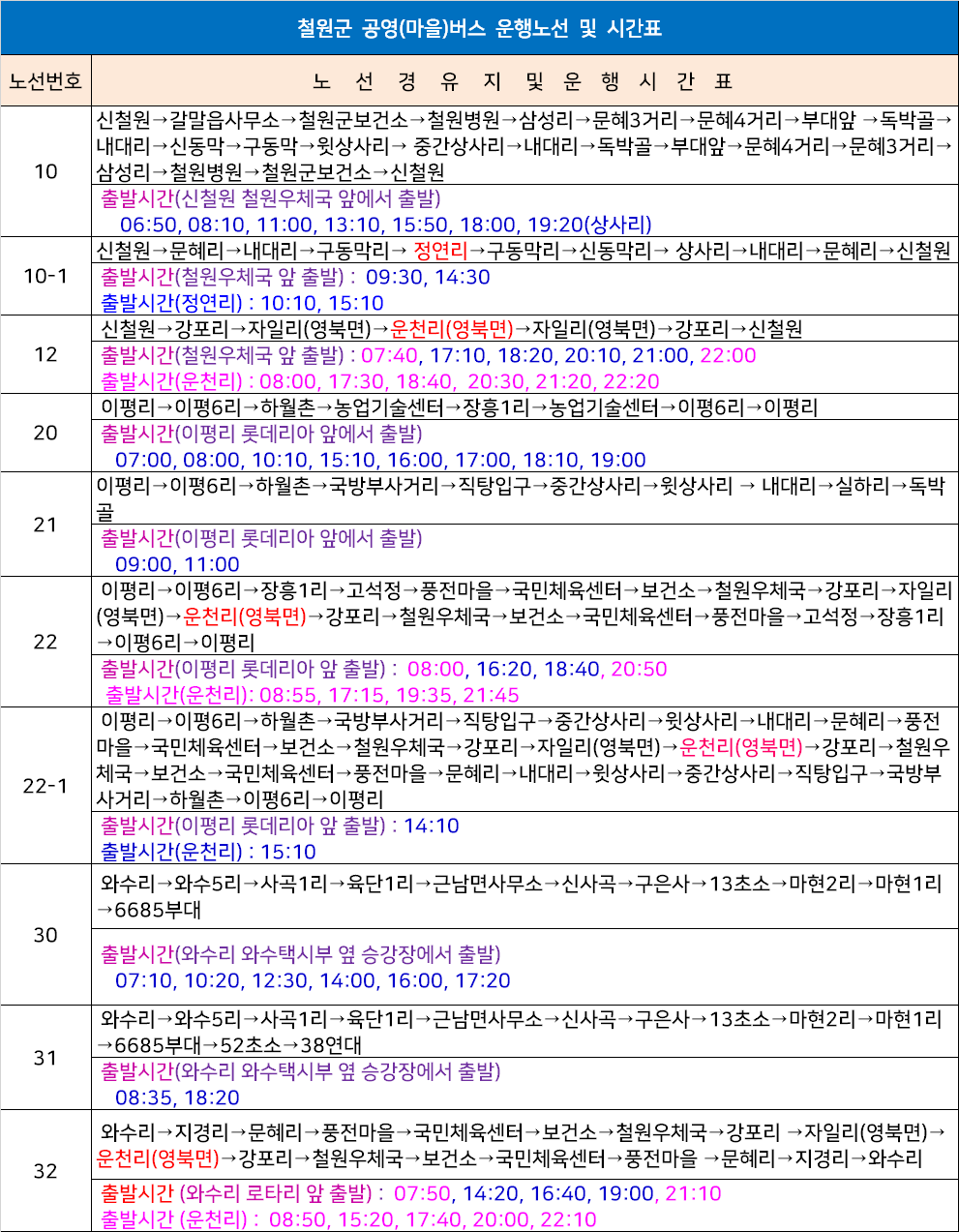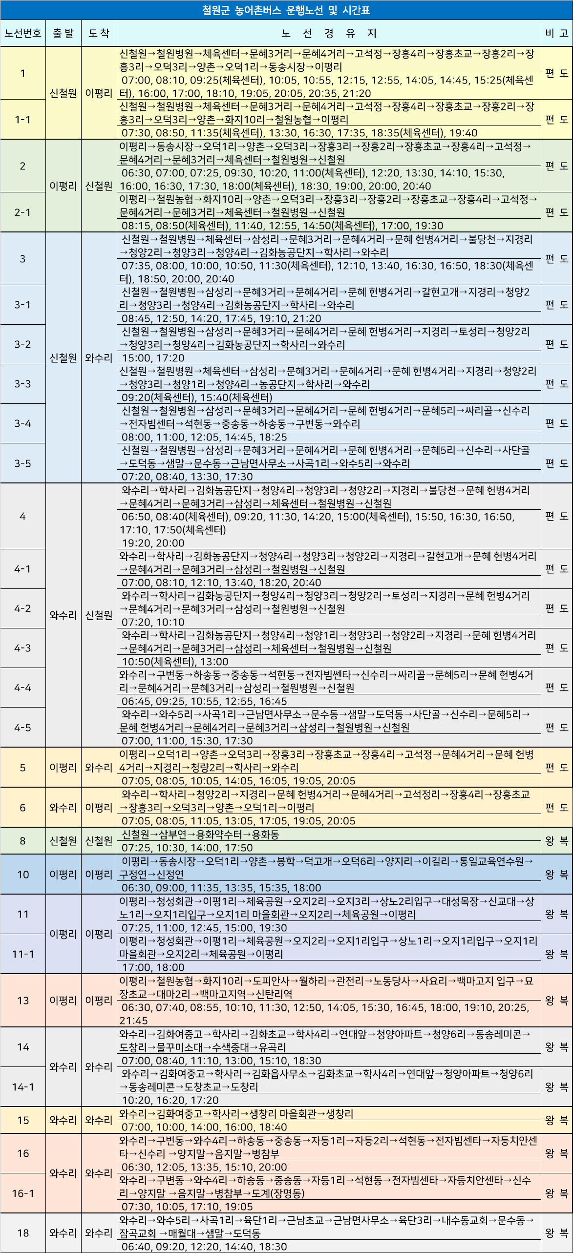 철원군 농어촌버스 운행노선 및 시간표