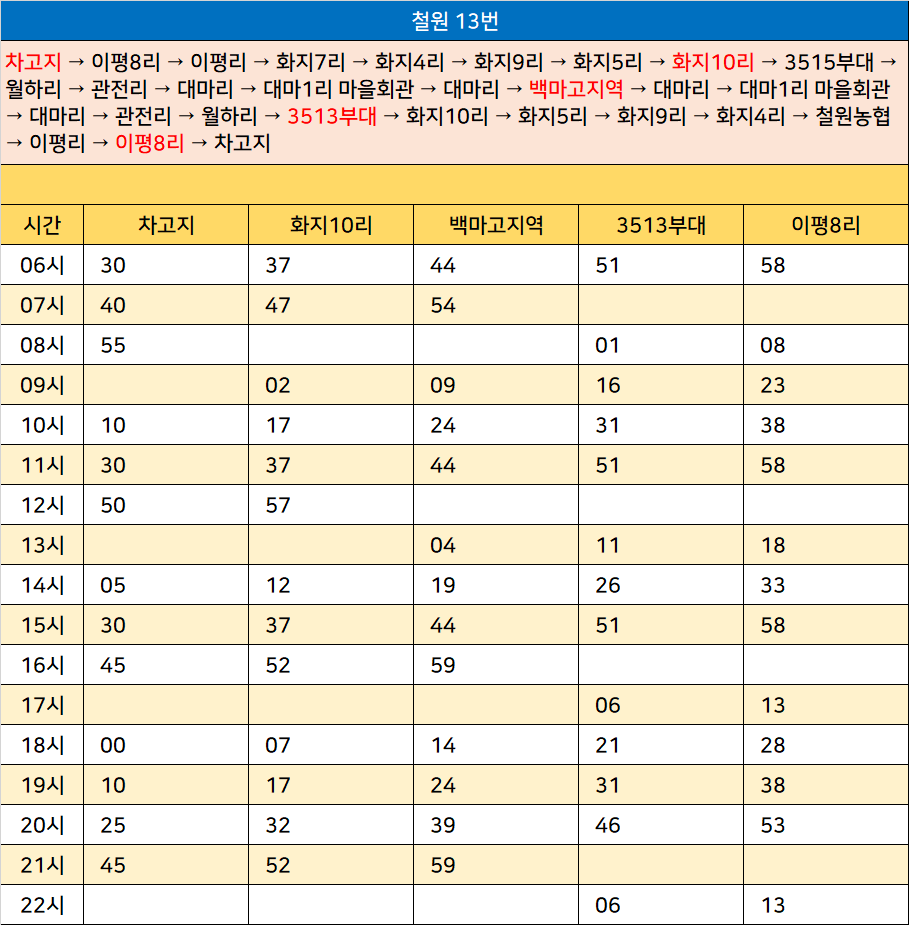 철원 13번: 차고지 → 이평8리 → 이평리 → 화지7리 → 화지4리 → 화지9리 → 화지5리 → 화지10리 → 3515부대 → 월하리 → 관전리 → 대마리 → 대마1리 마을회관 → 대마리 → 백마고지역 → 대마리 → 대마1리 마을회관 → 대마리 → 관전리 → 월하리 → 3513부대 → 화지10리 → 화지5리 → 화지9리 → 화지4리 → 철원농협 → 이평리 → 이평8리 → 차고지