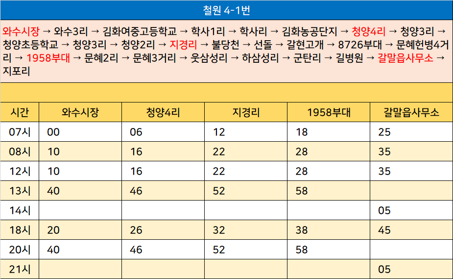 철원 4-1번: 와수시장 → 와수3리 → 김화여중고등학교 → 학사1리 → 학사리 → 김화농공단지 → 청양4리 → 청양3리 → 청양초등학교 → 청양3리 → 청양2리 → 지경리 → 불당천 → 선돌 → 갈현고개 → 8726부대 → 문혜헌병4거리 → 1958부대 → 문혜2리 → 문혜3거리 → 웃삼성리 → 하삼성리 → 군탄리 → 길병원 → 갈말읍사무소 → 지포리