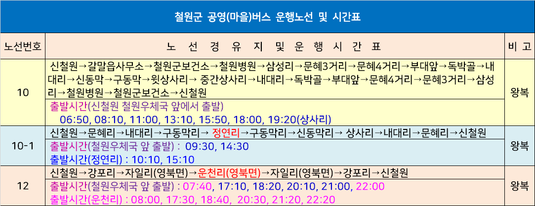 공영버스 운행노선 및 시간표(신철원 출발)