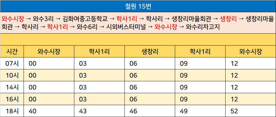 철원 15번: 와수시장 → 와수3리 → 김화여중고등학교 → 학사1리 → 학사리 → 생창리마을회관 → 생창리 → 생창리마을회관 → 학사리 → 학사1리 → 와수6리 → 시외버스터미널 → 와수시장 → 와수리차고지