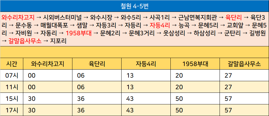 철원 4-5번: 와수리차고지 → 시외버스터미널 → 와수시장 → 와수5리 → 사곡1리 → 근남면복지회관 → 육단리 → 육단3리 → 문수동 → 매월대폭포 → 샘말 → 자등3리 → 자등리 → 자등4리 → 능곡 → 문혜5리 → 교회앞 → 문혜5리 → 자비원 → 자동리 → 1958부대 → 문혜2리 → 문혜3거리 → 웃삼성리 → 하삼성리 → 군탄리 → 길병원 → 갈말읍사무소 → 지포리
