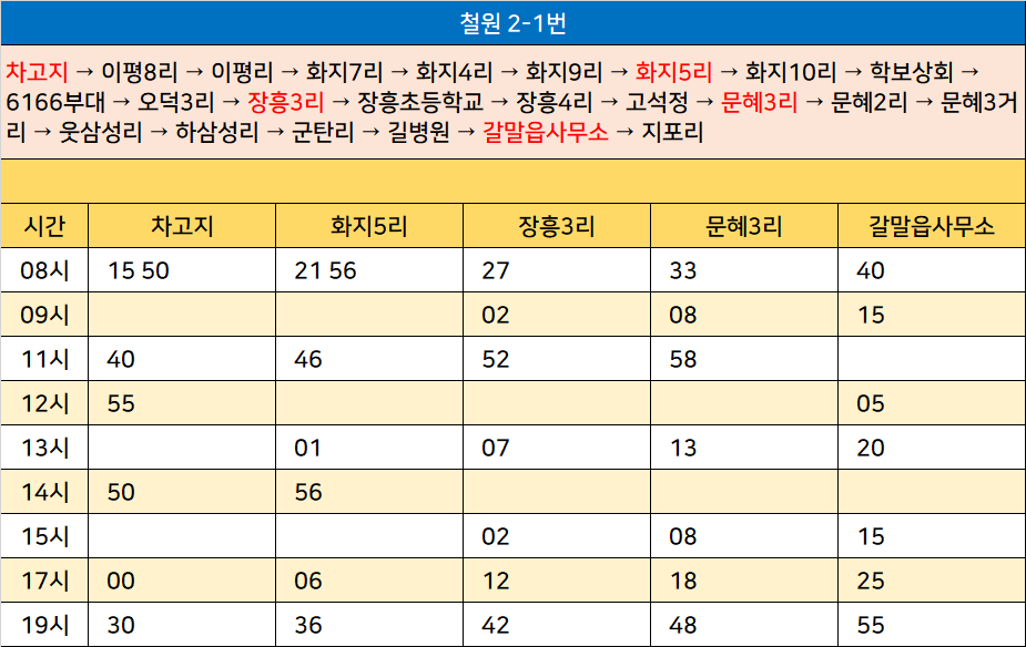 철원 2-1번: 차고지 → 이평8리 → 이평리 → 화지7리 → 화지4리 → 화지9리 → 화지5리 → 화지10리 → 학보상회 → 6166부대 → 오덕3리 → 장흥3리 → 장흥초등학교 → 장흥4리 → 고석정 → 문혜3리 → 문혜2리 → 문혜3거리 → 웃삼성리 → 하삼성리 → 군탄리 → 길병원 → 갈말읍사무소 → 지포리