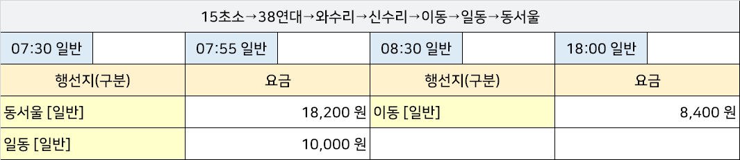 산양리시외고속버스터미널 산양리정류장 산양리정류소 → "15초소→38연대→와수리→신수리→이동→일동→동서울".