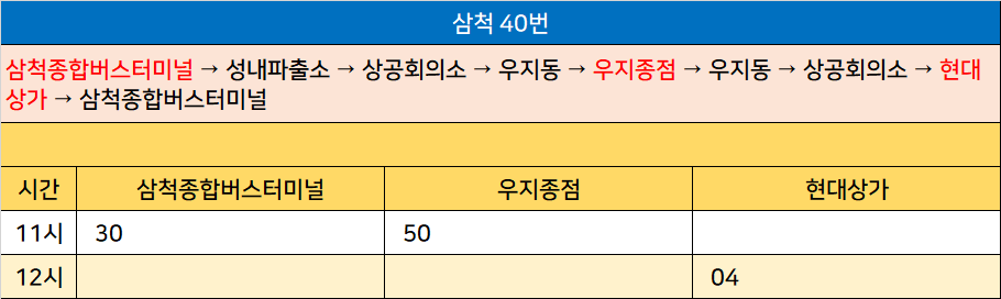삼척 40번: 삼척종합버스터미널 → 성내파출소 → 상공회의소 → 우지동 → 우지종점 → 우지동 → 상공회의소 → 현대상가 → 삼척종합버스터미널