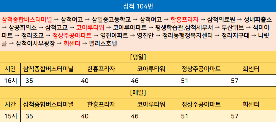 삼척 104번: 삼척종합버스터미널 → 삼척여고 → 삼일중고등학교 → 삼척여고 → 한흥프라자 → 삼척의료원 → 성내파출소 → 상공회의소 → 삼척고교 → 코아루타워 → 코아루아파트 → 평생학습관.삼척세무서 → 두산위브 → 석미아파트 → 정라초교 → 정상주공아파트 → 영진아파트 → 영진안 → 정라동행정복지센터 → 정라지구대 → 나릿골 → 삼척이사부광장 → 회센터 → 펠리스호텔