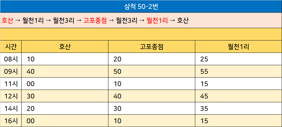 삼척 50-2번: 호산 → 월천1리 → 월천3리 → 고포종점 → 월천3리 → 월천1리 → 호산