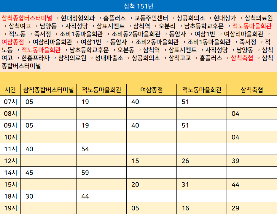 삼척 151번: 삼척종합버스터미널 → 현대정형외과 → 홈플러스 → 교동주민센터 → 상공회의소 → 현대상가 → 삼척의료원 → 삼척여고 → 남양동 → 사직성당 → 삼표시멘트 → 삼척역 → 오분리 → 남초등학교후문 → 적노동마을회관 → 적노동 → 죽서정 → 조비1동마을회관 → 조비동2동마을회관 → 동암사 → 여삼1반 → 여삼리마을회관 → 여삼종점 → 여삼리마을회관 → 여삼1반 → 동암사 → 조비2동마을회관 → 조비1동마을회관 → 죽서정 → 적노동 → 적노동마을회관 → 남초등학교후문 → 오분동 → 삼척역 → 삼표시멘트 → 사직성당 → 남양동 → 삼척여고 → 한흥프라자 → 삼척의료원 → 성내파출소 → 상공회의소 → 삼척고교 → 홈플러스 → 삼척축협 → 삼척종합버스터미널