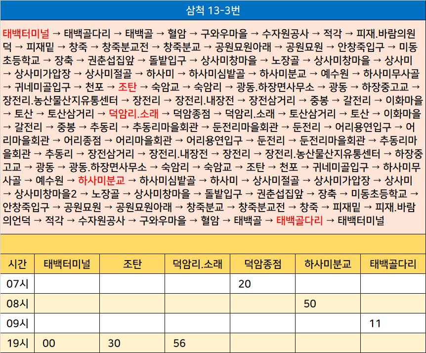 삼척 13-3번: 태백터미널 → 태백골다리 → 태백골 → 혈암 → 구와우마을 → 수자원공사 → 적각 → 피재.바람의원덕 → 피재밑 → 창죽 → 창죽분교전 → 창죽분교 → 공원묘원아래 → 공원묘원 → 안창죽입구 → 미동초등학교 → 장축 → 권춘섭집앞 → 돌밭입구 → 상사미창마을 → 노장골 → 상사미창마을 → 상사미 → 상사미가압장 → 상사미절골 → 하사미 → 하사미심밭골 → 하사미분교 → 예수원 → 하사미무사골 → 귀네미골입구 → 천포 → 조탄 → 숙암교 → 숙암리 → 광동.하장면사무소 → 광동 → 하장중고교 → 장전리.농산물산지유통센터 → 장전리 → 장전리.내장전 → 장전삼거리 → 중봉 → 갈전리 → 이화마을 → 토산 → 토산삼거리 → 덕암리.소래 → 덕암종점 → 덕암리.소래 → 토산삼거리 → 토산 → 이화마을 → 갈전리 → 중봉 → 추동리 → 추동리마을회관 → 둔전리마을회관 → 둔전리 → 어리용연입구 → 어리마을회관 → 어리종점 → 어리마을회관 → 어리용연입구 → 둔전리 → 둔전리마을회관 → 추동리마을회관 → 추동리 → 장전삼거리 → 장전리.내장전 → 장전리 → 장전리.농산물산지유통센터 → 하장중고교 → 광동 → 광동.하장면사무소 → 숙암리 → 숙암교 → 조탄 → 천포 → 귀네미골입구 → 하사미무사골 → 예수원 → 하사미분교 → 하사미심밭골 → 하사미 → 상사미절골 → 상사미가압장 → 상사미 → 상사미창마을2 → 노장골 → 상사미창마을 → 돌밭입구 → 권춘섭집앞 → 장축 → 미동초등학교 → 안창죽입구 → 공원묘원 → 공원묘원아래 → 창죽분교 → 창죽분교전 → 창죽 → 피재밑 → 피재.바람의언덕 → 적각 → 수자원공사 → 구와우마을 → 혈암 → 태백골 → 태백골다리 → 태백터미널