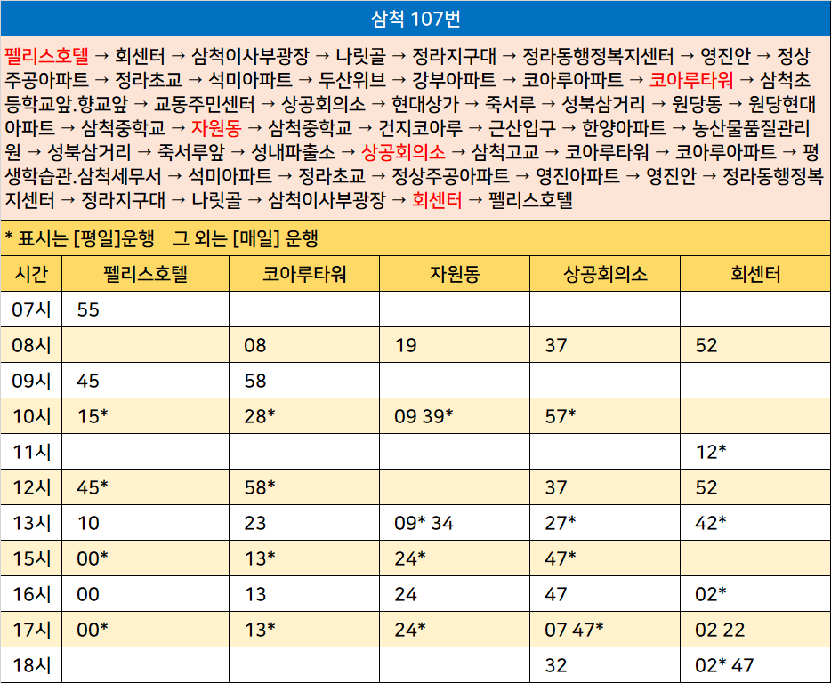 삼척 107번: 펠리스호텔 → 회센터 → 삼척이사부광장 → 나릿골 → 정라지구대 → 정라동행정복지센터 → 영진안 → 정상주공아파트 → 정라초교 → 석미아파트 → 두산위브 → 강부아파트 → 코아루아파트 → 코아루타워 → 삼척초등학교앞.향교앞 → 교동주민센터 → 상공회의소 → 현대상가 → 죽서루 → 성북삼거리 → 원당동 → 원당현대아파트 → 삼척중학교 → 자원동 → 삼척중학교 → 건지코아루 → 근산입구 → 한양아파트 → 농산물품질관리원 → 성북삼거리 → 죽서루앞 → 성내파출소 → 상공회의소 → 삼척고교 → 코아루타워 → 코아루아파트 → 평생학습관.삼척세무서 → 석미아파트 → 정라초교 → 정상주공아파트 → 영진아파트 → 영진안 → 정라동행정복지센터 → 정라지구대 → 나릿골 → 삼척이사부광장 → 회센터 → 펠리스호텔