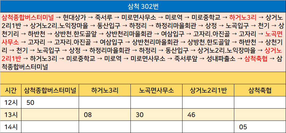 삼척 302번: 삼척종합버스터미널 → 현대상가 → 죽서루 → 미로면사무소 → 미로역 → 미로중학교 → 하거노3리 → 상거노2리1반 → 상거노2리.노익장마을 → 동산입구 → 하정리 → 하정리마을회관 → 상정 → 노곡입구 → 천기 → 상천기리 → 하반천 → 상반천.한도골앞 → 상반천리마을회관 → 여삼입구 → 고자리.아진골 → 고자리 → 노곡면사무소 → 고자리 → 고자리.아진골 → 여삼입구 → 상반천리마을회관 → 상방천.한도골앞 → 하반천 → 상천기리 → 천기 → 노곡입구 → 상정 → 하정리마을회관 → 하정리 → 동산입구 → 상거노2리.노익장마을 → 상거노2리1반 → 하거노3리 → 미로중학교 → 미로역 → 미로면사무소 → 죽서루앞 → 성내파출소 → 삼척축협 → 삼척종합버스터미널