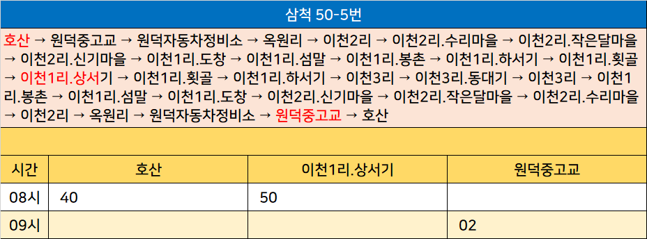 삼척 50-5번: 호산 → 원덕중고교 → 원덕자동차정비소 → 옥원리 → 이천2리 → 이천2리.수리마을 → 이천2리.작은달마을 → 이천2리.신기마을 → 이천1리.도창 → 이천1리.섬말 → 이천1리.봉촌 → 이천1리.하서기 → 이천1리.횟골 → 이천1리.상서기 → 이천1리.횟골 → 이천1리.하서기 → 이천3리 → 이천3리.동대기 → 이천3리 → 이천1리.봉촌 → 이천1리.섬말 → 이천1리.도창 → 이천2리.신기마을 → 이천2리.작은달마을 → 이천2리.수리마을 → 이천2리 → 옥원리 → 원덕자동차정비소 → 원덕중고교 → 호산