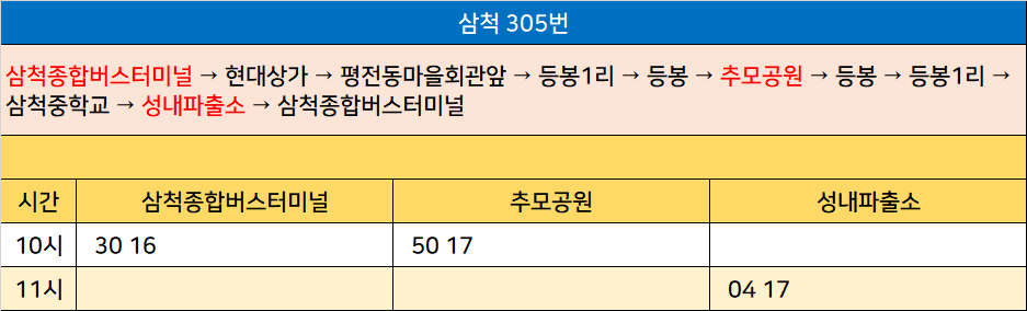 삼척 305번: 삼척종합버스터미널 → 현대상가 → 평전동마을회관앞 → 등봉1리 → 등봉 → 추모공원 → 등봉 → 등봉1리 → 삼척중학교 → 성내파출소 → 삼척종합버스터미널