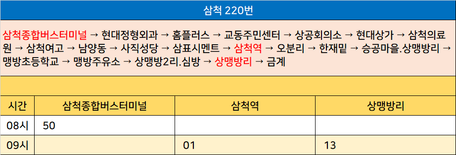 삼척 220번: 삼척종합버스터미널 → 현대정형외과 → 홈플러스 → 교동주민센터 → 상공회의소 → 현대상가 → 삼척의료원 → 삼척여고 → 남양동 → 사직성당 → 삼표시멘트 → 삼척역 → 오분리 → 한재밑 → 승공마을.상맹방리 → 맹방초등학교 → 맹방주유소 → 상맹방2리.심방 → 상맹방리 → 금계