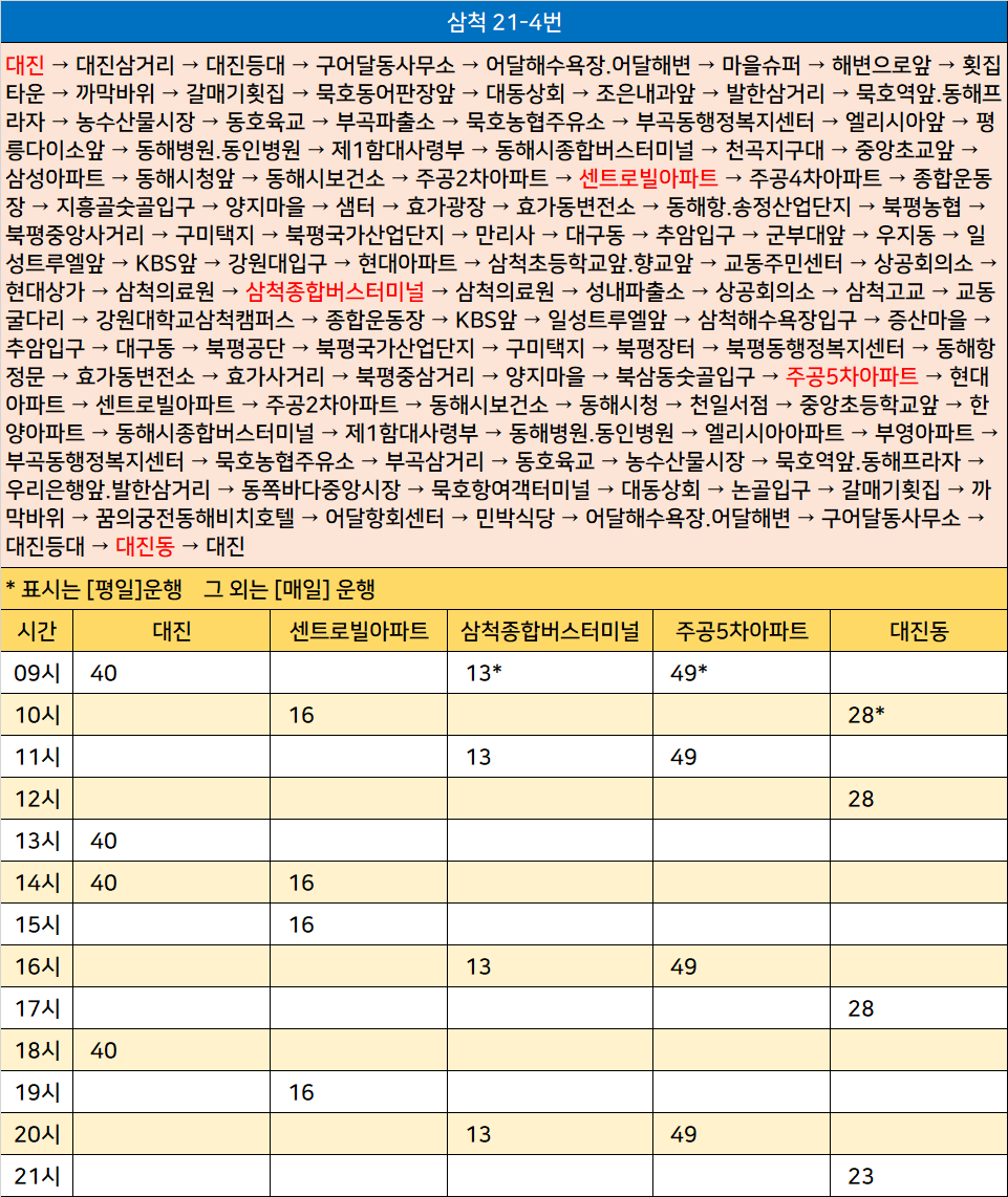 삼척 21-4번: 대진 → 대진삼거리 → 대진등대 → 구어달동사무소 → 어달해수욕장.어달해변 → 마을슈퍼 → 해변으로앞 → 횟집타운 → 까막바위 → 갈매기횟집 → 묵호동어판장앞 → 대동상회 → 조은내과앞 → 발한삼거리 → 묵호역앞.동해프라자 → 농수산물시장 → 동호육교 → 부곡파출소 → 묵호농협주유소 → 부곡동행정복지센터 → 엘리시아앞 → 평릉다이소앞 → 동해병원.동인병원 → 제1함대사령부 → 동해시종합버스터미널 → 천곡지구대 → 중앙초교앞 → 삼성아파트 → 동해시청앞 → 동해시보건소 → 주공2차아파트 → 센트로빌아파트 → 주공4차아파트 → 종합운동장 → 지흥골숫골입구 → 양지마을 → 샘터 → 효가광장 → 효가동변전소 → 동해항.송정산업단지 → 북평농협 → 북평중앙사거리 → 구미택지 → 북평국가산업단지 → 만리사 → 대구동 → 추암입구 → 군부대앞 → 우지동 → 일성트루엘앞 → KBS앞 → 강원대입구 → 현대아파트 → 삼척초등학교앞.향교앞 → 교동주민센터 → 상공회의소 → 현대상가 → 삼척의료원 → 삼척종합버스터미널 → 삼척의료원 → 성내파출소 → 상공회의소 → 삼척고교 → 교동굴다리 → 강원대학교삼척캠퍼스 → 종합운동장 → KBS앞 → 일성트루엘앞 → 삼척해수욕장입구 → 증산마을 → 추암입구 → 대구동 → 북평공단 → 북평국가산업단지 → 구미택지 → 북평장터 → 북평동행정복지센터 → 동해항정문 → 효가동변전소 → 효가사거리 → 북평중삼거리 → 양지마을 → 북삼동숫골입구 → 주공5차아파트 → 현대아파트 → 센트로빌아파트 → 주공2차아파트 → 동해시보건소 → 동해시청 → 천일서점 → 중앙초등학교앞 → 한양아파트 → 동해시종합버스터미널 → 제1함대사령부 → 동해병원.동인병원 → 엘리시아아파트 → 부영아파트 → 부곡동행정복지센터 → 묵호농협주유소 → 부곡삼거리 → 동호육교 → 농수산물시장 → 묵호역앞.동해프라자 → 우리은행앞.발한삼거리 → 동쪽바다중앙시장 → 묵호항여객터미널 → 대동상회 → 논골입구 → 갈매기횟집 → 까막바위 → 꿈의궁전동해비치호텔 → 어달항회센터 → 민박식당 → 어달해수욕장.어달해변 → 구어달동사무소 → 대진등대 → 대진동 → 대진