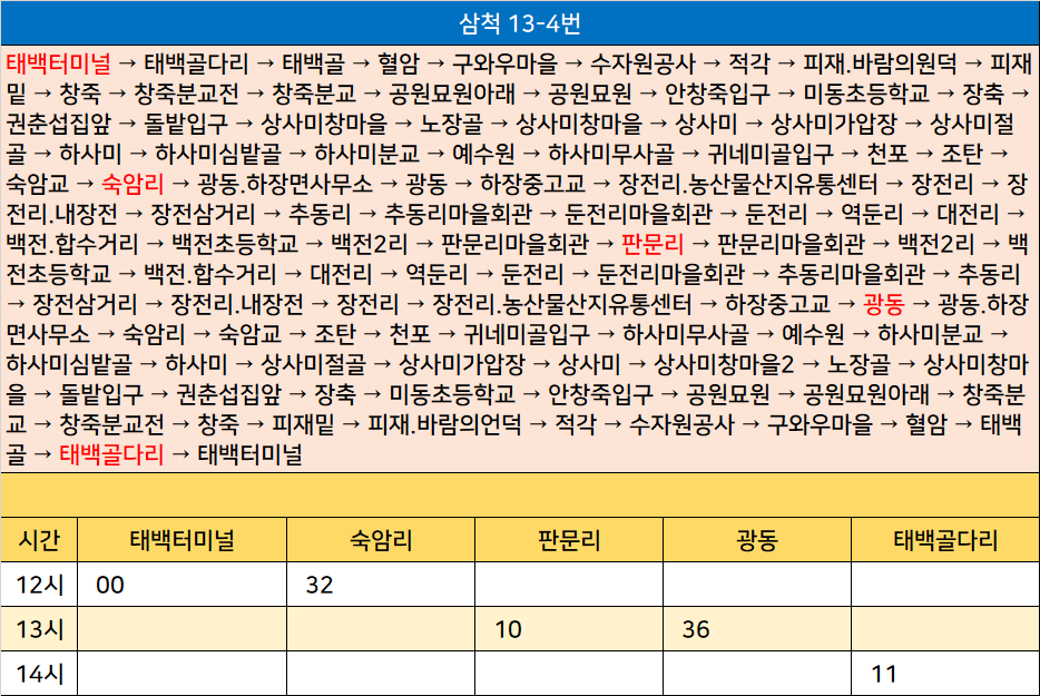 삼척 13-4번: 태백터미널 → 태백골다리 → 태백골 → 혈암 → 구와우마을 → 수자원공사 → 적각 → 피재.바람의원덕 → 피재밑 → 창죽 → 창죽분교전 → 창죽분교 → 공원묘원아래 → 공원묘원 → 안창죽입구 → 미동초등학교 → 장축 → 권춘섭집앞 → 돌밭입구 → 상사미창마을 → 노장골 → 상사미창마을 → 상사미 → 상사미가압장 → 상사미절골 → 하사미 → 하사미심밭골 → 하사미분교 → 예수원 → 하사미무사골 → 귀네미골입구 → 천포 → 조탄 → 숙암교 → 숙암리 → 광동.하장면사무소 → 광동 → 하장중고교 → 장전리.농산물산지유통센터 → 장전리 → 장전리.내장전 → 장전삼거리 → 추동리 → 추동리마을회관 → 둔전리마을회관 → 둔전리 → 역둔리 → 대전리 → 백전.합수거리 → 백전초등학교 → 백전2리 → 판문리마을회관 → 판문리 → 판문리마을회관 → 백전2리 → 백전초등학교 → 백전.합수거리 → 대전리 → 역둔리 → 둔전리 → 둔전리마을회관 → 추동리마을회관 → 추동리 → 장전삼거리 → 장전리.내장전 → 장전리 → 장전리.농산물산지유통센터 → 하장중고교 → 광동 → 광동.하장면사무소 → 숙암리 → 숙암교 → 조탄 → 천포 → 귀네미골입구 → 하사미무사골 → 예수원 → 하사미분교 → 하사미심밭골 → 하사미 → 상사미절골 → 상사미가압장 → 상사미 → 상사미창마을2 → 노장골 → 상사미창마을 → 돌밭입구 → 권춘섭집앞 → 장축 → 미동초등학교 → 안창죽입구 → 공원묘원 → 공원묘원아래 → 창죽분교 → 창죽분교전 → 창죽 → 피재밑 → 피재.바람의언덕 → 적각 → 수자원공사 → 구와우마을 → 혈암 → 태백골 → 태백골다리 → 태백터미널