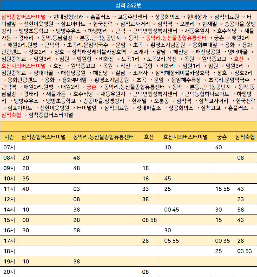 삼척 242번: 삼척종합버스터미널 → 현대정형외과 → 홈플러스 → 교동주민센터 → 상공회의소 → 현대상가 → 삼척의료원 → 터미널앞 → 선한이웃병원 → 삼표아파트 → 한국전력 → 삼척교사거리 → 삼척역 → 오분리 → 한재밑 → 승공마을.상맹방리 → 맹방초등학교 → 맹방주유소 → 하맹방리 → 근덕 → 근덕면행정복지센터 → 재동유원지 → 호수식당 → 새들가든 → 광태리 → 동막.동남철강 → 본동.근덕농공단지 → 동막 → 동막리.농산물종합유통센터 → 궁촌 → 매원2리 → 매원2리.원평 → 근덕역 → 초곡리.문암막국수 → 문암 → 초곡 → 황영조기념공원 → 용화부대앞 → 용화 → 용화관광랜드 → 장호2리 → 장호 → 삼척해상케이블카장호역 → 조개사 → 갈남 → 해신당 → 해신당공원 → 양대마골 → 임원중학교 → 임원3리 → 임원 → 임원항 → 비화진 → 노곡1리 → 노곡2리.작진 → 옥원 → 원덕중고교 → 호산 → 호산시외버스터미널 → 호산 → 원덕중고교 → 옥원 → 작진 → 노곡항 → 비화리 → 임원1리 → 임원 → 임원3리 → 임원중학교 → 양대마골 → 해신당공원 → 해신당 → 갈남 → 조개사 → 삼척해상케이블카장호역 → 장호 → 장호2리 → 용화관광랜드 → 용화 → 용화부대앞 → 황영조기념공원 → 초곡 → 문암 → 문암해수욕장 → 초곡리.문암막국수 → 근덕역 → 매원2리.원평 → 매원2리 → 궁촌 → 동막리.농산물종합유통센터 → 동막 → 본동.근덕농공단지 → 동막.동남철강 → 광태리 → 새들가든 → 호수식당 → 재동유원지 → 근덕면행정복지센터 → 근덕농협하나로마트 → 하맹방리 → 맹방주유소 → 맹방초등학교 → 승공마을.상맹방리 → 한재밑 → 오분동 → 삼척역 → 삼척교사거리 → 한국전력 → 삼표아파트 → 선한이웃병원 → 터미널앞 → 삼척의료원 → 성내파출소 → 상공회의소 → 삼척고교 → 홈플러스 → 삼척축협 → 삼척종합버스터미널
