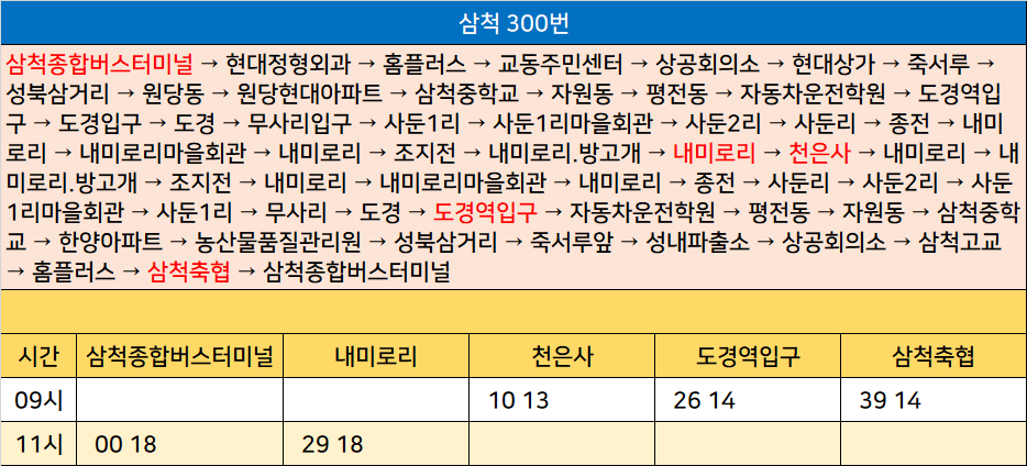 삼척 300번: 삼척종합버스터미널 → 현대정형외과 → 홈플러스 → 교동주민센터 → 상공회의소 → 현대상가 → 죽서루 → 성북삼거리 → 원당동 → 원당현대아파트 → 삼척중학교 → 자원동 → 평전동 → 자동차운전학원 → 도경역입구 → 도경입구 → 도경 → 무사리입구 → 사둔1리 → 사둔1리마을회관 → 사둔2리 → 사둔리 → 종전 → 내미로리 → 내미로리마을회관 → 내미로리 → 조지전 → 내미로리.방고개 → 내미로리 → 천은사 → 내미로리 → 내미로리.방고개 → 조지전 → 내미로리 → 내미로리마을회관 → 내미로리 → 종전 → 사둔리 → 사둔2리 → 사둔1리마을회관 → 사둔1리 → 무사리 → 도경 → 도경역입구 → 자동차운전학원 → 평전동 → 자원동 → 삼척중학교 → 한양아파트 → 농산물품질관리원 → 성북삼거리 → 죽서루앞 → 성내파출소 → 상공회의소 → 삼척고교 → 홈플러스 → 삼척축협 → 삼척종합버스터미널