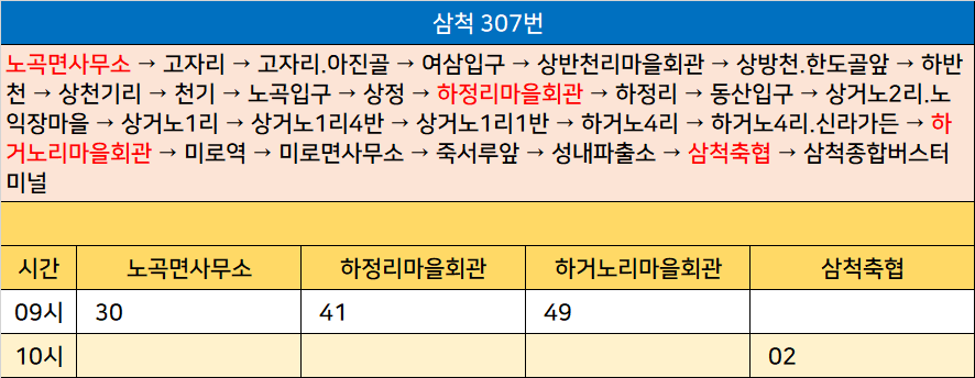 삼척 307번: 노곡면사무소 → 고자리 → 고자리.아진골 → 여삼입구 → 상반천리마을회관 → 상방천.한도골앞 → 하반천 → 상천기리 → 천기 → 노곡입구 → 상정 → 하정리마을회관 → 하정리 → 동산입구 → 상거노2리.노익장마을 → 상거노1리 → 상거노1리4반 → 상거노1리1반 → 하거노4리 → 하거노4리.신라가든 → 하거노리마을회관 → 미로역 → 미로면사무소 → 죽서루앞 → 성내파출소 → 삼척축협 → 삼척종합버스터미널