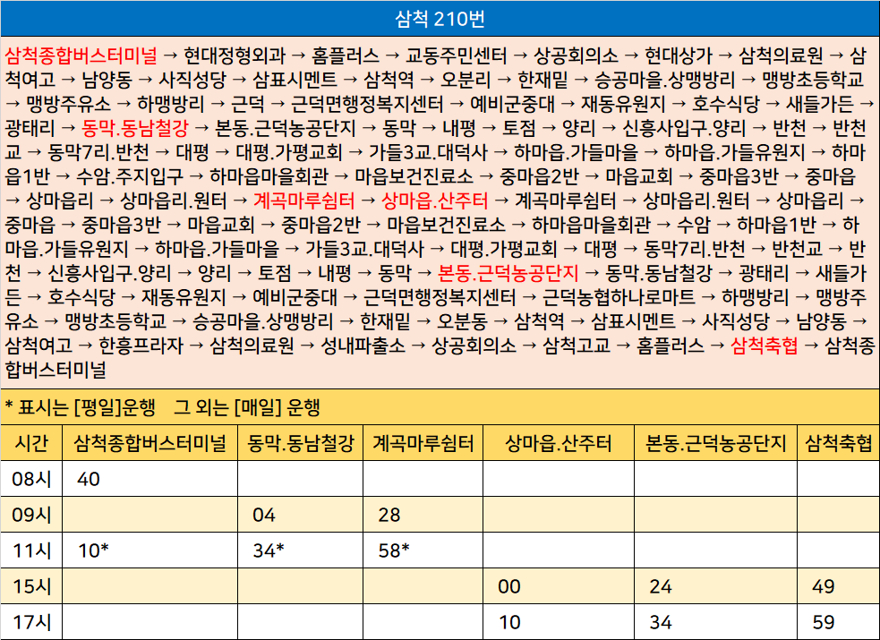 삼척 210번: 삼척종합버스터미널 → 현대정형외과 → 홈플러스 → 교동주민센터 → 상공회의소 → 현대상가 → 삼척의료원 → 삼척여고 → 남양동 → 사직성당 → 삼표시멘트 → 삼척역 → 오분리 → 한재밑 → 승공마을.상맹방리 → 맹방초등학교 → 맹방주유소 → 하맹방리 → 근덕 → 근덕면행정복지센터 → 예비군중대 → 재동유원지 → 호수식당 → 새들가든 → 광태리 → 동막.동남철강 → 본동.근덕농공단지 → 동막 → 내평 → 토점 → 양리 → 신흥사입구.양리 → 반천 → 반천교 → 동막7리.반천 → 대평 → 대평.가평교회 → 가들3교.대덕사 → 하마읍.가들마을 → 하마읍.가들유원지 → 하마읍1반 → 수암.주지입구 → 하마읍마을회관 → 마읍보건진료소 → 중마읍2반 → 마읍교회 → 중마읍3반 → 중마읍 → 상마읍리 → 상마읍리.원터 → 계곡마루쉼터 → 상마읍.산주터 → 계곡마루쉼터 → 상마읍리.원터 → 상마읍리 → 중마읍 → 중마읍3반 → 마읍교회 → 중마읍2반 → 마읍보건진료소 → 하마읍마을회관 → 수암 → 하마읍1반 → 하마읍.가들유원지 → 하마읍.가들마을 → 가들3교.대덕사 → 대평.가평교회 → 대평 → 동막7리.반천 → 반천교 → 반천 → 신흥사입구.양리 → 양리 → 토점 → 내평 → 동막 → 본동.근덕농공단지 → 동막.동남철강 → 광태리 → 새들가든 → 호수식당 → 재동유원지 → 예비군중대 → 근덕면행정복지센터 → 근덕농협하나로마트 → 하맹방리 → 맹방주유소 → 맹방초등학교 → 승공마을.상맹방리 → 한재밑 → 오분동 → 삼척역 → 삼표시멘트 → 사직성당 → 남양동 → 삼척여고 → 한흥프라자 → 삼척의료원 → 성내파출소 → 상공회의소 → 삼척고교 → 홈플러스 → 삼척축협 → 삼척종합버스터미널