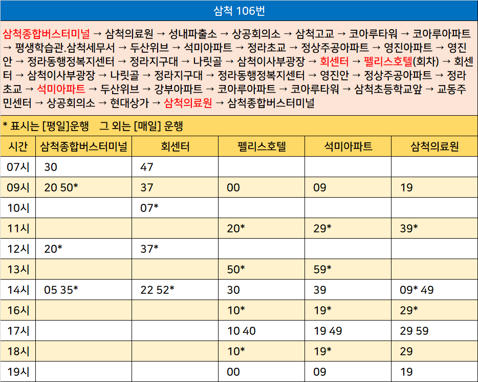 삼척 106번: 삼척종합버스터미널 → 삼척의료원 → 성내파출소 → 상공회의소 → 삼척고교 → 코아루타워 → 코아루아파트 → 평생학습관.삼척세무서 → 두산위브 → 석미아파트 → 정라초교 → 정상주공아파트 → 영진아파트 → 영진안 → 정라동행정복지센터 → 정라지구대 → 나릿골 → 삼척이사부광장 → 회센터 → 펠리스호텔(회차) → 회센터 → 삼척이사부광장 → 나릿골 → 정라지구대 → 정라동행정복지센터 → 영진안 → 정상주공아파트 → 정라초교 → 석미아파트 → 두산위브 → 강부아파트 → 코아루아파트 → 코아루타워 → 삼척초등학교앞 → 교동주민센터 → 상공회의소 → 현대상가 → 삼척의료원 → 삼척종합버스터미널