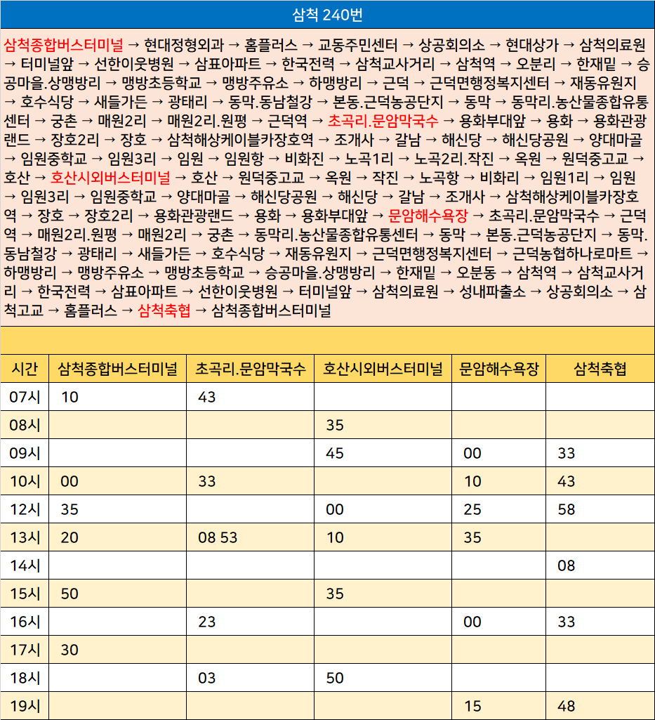 삼척 240번: 삼척종합버스터미널 → 현대정형외과 → 홈플러스 → 교동주민센터 → 상공회의소 → 현대상가 → 삼척의료원 → 터미널앞 → 선한이웃병원 → 삼표아파트 → 한국전력 → 삼척교사거리 → 삼척역 → 오분리 → 한재밑 → 승공마을.상맹방리 → 맹방초등학교 → 맹방주유소 → 하맹방리 → 근덕 → 근덕면행정복지센터 → 재동유원지 → 호수식당 → 새들가든 → 광태리 → 동막.동남철강 → 본동.근덕농공단지 → 동막 → 동막리.농산물종합유통센터 → 궁촌 → 매원2리 → 매원2리.원평 → 근덕역 → 초곡리.문암막국수 → 용화부대앞 → 용화 → 용화관광랜드 → 장호2리 → 장호 → 삼척해상케이블카장호역 → 조개사 → 갈남 → 해신당 → 해신당공원 → 양대마골 → 임원중학교 → 임원3리 → 임원 → 임원항 → 비화진 → 노곡1리 → 노곡2리.작진 → 옥원 → 원덕중고교 → 호산 → 호산시외버스터미널 → 호산 → 원덕중고교 → 옥원 → 작진 → 노곡항 → 비화리 → 임원1리 → 임원 → 임원3리 → 임원중학교 → 양대마골 → 해신당공원 → 해신당 → 갈남 → 조개사 → 삼척해상케이블카장호역 → 장호 → 장호2리 → 용화관광랜드 → 용화 → 용화부대앞 → 문암해수욕장 → 초곡리.문암막국수 → 근덕역 → 매원2리.원평 → 매원2리 → 궁촌 → 동막리.농산물종합유통센터 → 동막 → 본동.근덕농공단지 → 동막.동남철강 → 광태리 → 새들가든 → 호수식당 → 재동유원지 → 근덕면행정복지센터 → 근덕농협하나로마트 → 하맹방리 → 맹방주유소 → 맹방초등학교 → 승공마을.상맹방리 → 한재밑 → 오분동 → 삼척역 → 삼척교사거리 → 한국전력 → 삼표아파트 → 선한이웃병원 → 터미널앞 → 삼척의료원 → 성내파출소 → 상공회의소 → 삼척고교 → 홈플러스 → 삼척축협 → 삼척종합버스터미널