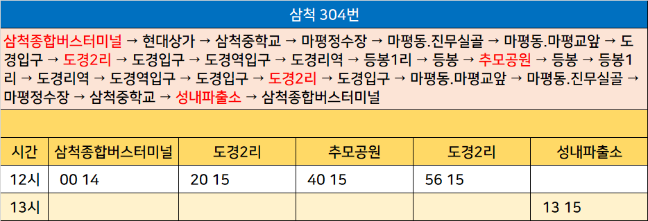 삼척 304번: 삼척종합버스터미널 → 현대상가 → 삼척중학교 → 마평정수장 → 마평동.진무실골 → 마평동.마평교앞 → 도경입구 → 도경2리 → 도경입구 → 도경역입구 → 도경리역 → 등봉1리 → 등봉 → 추모공원 → 등봉 → 등봉1리 → 도경리역 → 도경역입구 → 도경입구 → 도경2리 → 도경입구 → 마평동.마평교앞 → 마평동.진무실골 → 마평정수장 → 삼척중학교 → 성내파출소 → 삼척종합버스터미널