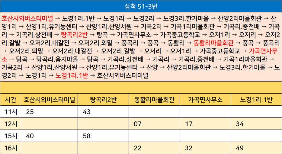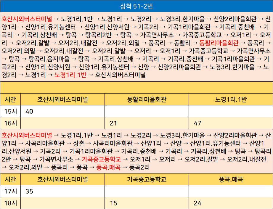 삼척 51-1번: 호산시외버스터미널 → 노경1리.1반 → 노경1리 → 노경2리 → 노경3리.한기마을 → 산양2리마을회관 → 산양1리 → 산양1리.유기농센터 → 산양1리.산양서원 → 기곡2리 → 기곡1리마을회관 → 기곡리.중천배 → 기곡리 → 기곡리.상천배 → 탕곡 → 탕곡리2반 → 탕곡 → 가곡면사무소 → 가곡중고등학교 → 오저1리 → 오저리 → 오저2리.갈밭 → 오저2리.내갈전 → 오저2리.외밑 → 풍곡리 → 풍곡 → 풍곡.매곡 → 풍곡 → 풍곡리 → 오저2리.외밑 → 오저2리.내갈전 → 오저2리.갈밭 → 오저리 → 오저1리 → 가곡중고등학교 → 가곡면사무소 → 탕곡 → 탕곡리.음지마을 → 탕곡 → 기곡리.상천배 → 기곡리 → 기곡리.중천배 → 기곡1리마을회관 → 기곡2리 → 산양1리.산양서원 → 산양1리.유기농센터 → 산양 → 산양2리마을회관 → 노경3리.한기마을 → 노경2리 → 노경1리 → 노경1리.1반 → 호산시외버스터미널