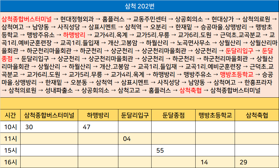 삼척 202번: 삼척종합버스터미널 → 현대정형외과 → 홈플러스 → 교동주민센터 → 상공회의소 → 현대상가 → 삼척의료원 → 삼척여고 → 남양동 → 사직성당 → 삼표시멘트 → 삼척역 → 오분리 → 한재밑 → 승공마을.상맹방리 → 맹방초등학교 → 맹방주유소 → 하맹방리 → 교가4리.옥계 → 교가5리.무릉 → 교가6리.도원 → 근덕초.교곡분교 → 교곡1리.예비군훈련장 → 교곡1리.들입재 → 개산.고봉암 → 하월산리 → 노곡면사무소 → 상월산리 → 상월산리마을회관 → 하군천리마을회관 → 하군천리 → 상군천리 → 상군천리마을회관 → 상군천리 → 둔달리입구 → 둔달종점 → 둔달리입구 → 상군천리 → 상군천리마을회관 → 상군천리 → 하군천리 → 하군천리마을회관 → 상월산리마을회관 → 상월산리 → 하월산리 → 개산.고봉암 → 교곡1리.들입재 → 교곡1리.예비군훈련장 → 근덕초.교곡분교 → 교가6리.도원 → 교가5리.무릉 → 교가4리.옥계 → 하맹방리 → 맹방주유소 → 맹방초등학교 → 승공마을.상맹방리 → 한재밑 → 오분동 → 삼척역 → 삼표시멘트 → 사직성당 → 남양동 → 삼척여고 → 한흥프라자 → 삼척의료원 → 성내파출소 → 상공회의소 → 삼척고교 → 홈플러스 → 삼척축협 → 삼척종합버스터미널