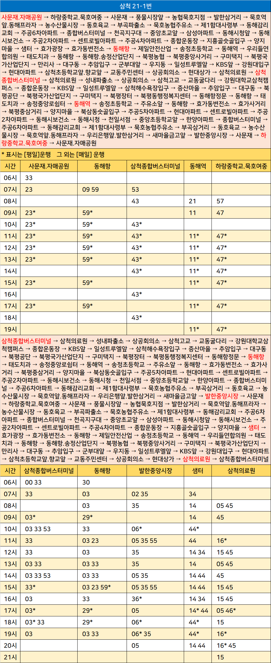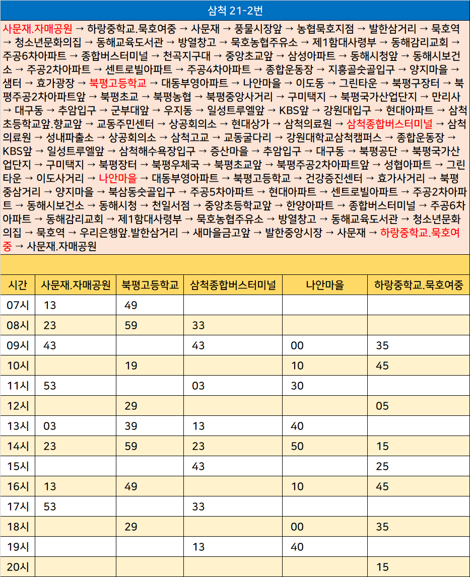 삼척 21-2번: 사문재.자매공원 → 하랑중학교.묵호여중 → 사문재 → 풍물시장앞 → 농협묵호지점 → 발한삼거리 → 묵호역 → 청소년문화의집 → 동해교육도서관 → 방열창고 → 묵호농협주유소 → 제1함대사령부 → 동해감리교회 → 주공6차아파트 → 종합버스터미널 → 천곡지구대 → 중앙초교앞 → 삼성아파트 → 동해시청앞 → 동해시보건소 → 주공2차아파트 → 센트로빌아파트 → 주공4차아파트 → 종합운동장 → 지흥골숫골입구 → 양지마을 → 샘터 → 효가광장 → 북평고등학교 → 대동부영아파트 → 나안마을 → 이도동 → 그린타운 → 북평구장터 → 북평주공2차아파트앞 → 북평초교 → 북평농협 → 북평중앙사거리 → 구미택지 → 북평국가산업단지 → 만리사 → 대구동 → 추암입구 → 군부대앞 → 우지동 → 일성트루엘앞 → KBS앞 → 강원대입구 → 현대아파트 → 삼척초등학교앞.향교앞 → 교동주민센터 → 상공회의소 → 현대상가 → 삼척의료원 → 삼척종합버스터미널 → 삼척의료원 → 성내파출소 → 상공회의소 → 삼척고교 → 교동굴다리 → 강원대학교삼척캠퍼스 → 종합운동장 → KBS앞 → 일성트루엘앞 → 삼척해수욕장입구 → 증산마을 → 추암입구 → 대구동 → 북평공단 → 북평국가산업단지 → 구미택지 → 북평장터 → 북평우체국 → 북평초교앞 → 북평주공2차아파트앞 → 성협아파트 → 그린타운 → 이도사거리 → 나안마을 → 대동부영아파트 → 북평고등학교 → 건강증진센터 → 효가사거리 → 북평중삼거리 → 양지마을 → 북삼동숫골입구 → 주공5차아파트 → 현대아파트 → 센트로빌아파트 → 주공2차아파트 → 동해시보건소 → 동해시청 → 천일서점 → 중앙초등학교앞 → 한양아파트 → 종합버스터미널 → 주공6차아파트 → 동해감리교회 → 제1함대사령부 → 묵호농협주유소 → 방열창고 → 동해교육도서관 → 청소년문화의집 → 묵호역 → 우리은행앞.발한삼거리 → 새마을금고앞 → 발한중앙시장 → 사문재 → 하랑중학교.묵호여중 → 사문재.자매공원