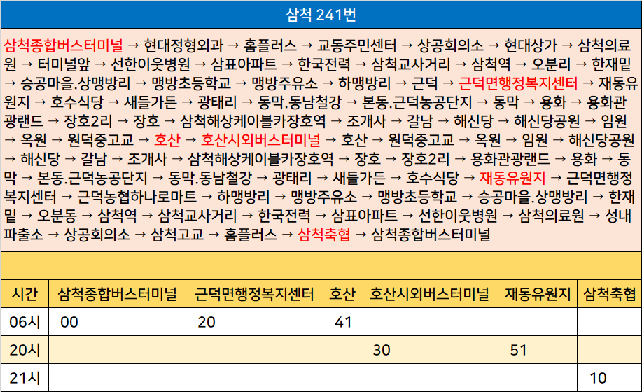 삼척 241번: 삼척종합버스터미널 → 현대정형외과 → 홈플러스 → 교동주민센터 → 상공회의소 → 현대상가 → 삼척의료원 → 터미널앞 → 선한이웃병원 → 삼표아파트 → 한국전력 → 삼척교사거리 → 삼척역 → 오분리 → 한재밑 → 승공마을.상맹방리 → 맹방초등학교 → 맹방주유소 → 하맹방리 → 근덕 → 근덕면행정복지센터 → 재동유원지 → 호수식당 → 새들가든 → 광태리 → 동막.동남철강 → 본동.근덕농공단지 → 동막 → 용화 → 용화관광랜드 → 장호2리 → 장호 → 삼척해상케이블카장호역 → 조개사 → 갈남 → 해신당 → 해신당공원 → 임원 → 옥원 → 원덕중고교 → 호산 → 호산시외버스터미널 → 호산 → 원덕중고교 → 옥원 → 임원 → 해신당공원 → 해신당 → 갈남 → 조개사 → 삼척해상케이블카장호역 → 장호 → 장호2리 → 용화관광랜드 → 용화 → 동막 → 본동.근덕농공단지 → 동막.동남철강 → 광태리 → 새들가든 → 호수식당 → 재동유원지 → 근덕면행정복지센터 → 근덕농협하나로마트 → 하맹방리 → 맹방주유소 → 맹방초등학교 → 승공마을.상맹방리 → 한재밑 → 오분동 → 삼척역 → 삼척교사거리 → 한국전력 → 삼표아파트 → 선한이웃병원 → 삼척의료원 → 성내파출소 → 상공회의소 → 삼척고교 → 홈플러스 → 삼척축협 → 삼척종합버스터미널