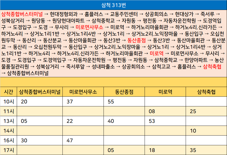 삼척 313번: 삼척종합버스터미널 → 현대정형외과 → 홈플러스 → 교동주민센터 → 상공회의소 → 현대상가 → 죽서루 → 성북삼거리 → 원당동 → 원당현대아파트 → 삼척중학교 → 자원동 → 평전동 → 자동차운전학원 → 도경역입구 → 도경입구 → 도경 → 무사리 → 미로면사무소 → 미로역 → 하거노리마을회관 → 하거노4리.신라가든 → 하거노4리 → 상거노1리1반 → 상거노1리4반 → 상거노1리 → 상거노2리.노익장마을 → 동산입구 → 오십천원두막 → 동산리 → 동산분교 → 동산마을회관 → 동산3반 → 동산종점 → 동산3반 → 동산마을회관 → 동산분교 → 동산리 → 오십천원두막 → 동산입구 → 상거노2리.노익장마을 → 상거노1리 → 상거노1리4반 → 상거노1리1반 → 하거노4리 → 하거노4리.신라가든 → 하거노리마을회관 → 미로역 → 미로면사무소 → 무사리 → 도경 → 도경입구 → 도경역입구 → 자동차운전학원 → 평전동 → 자원동 → 삼척중학교 → 한양아파트 → 농산물품질관리원 → 성북삼거리 → 죽서루앞 → 성내파출소 → 상공회의소 → 삼척고교 → 홈플러스 → 삼척축협 → 삼척종합버스터미널