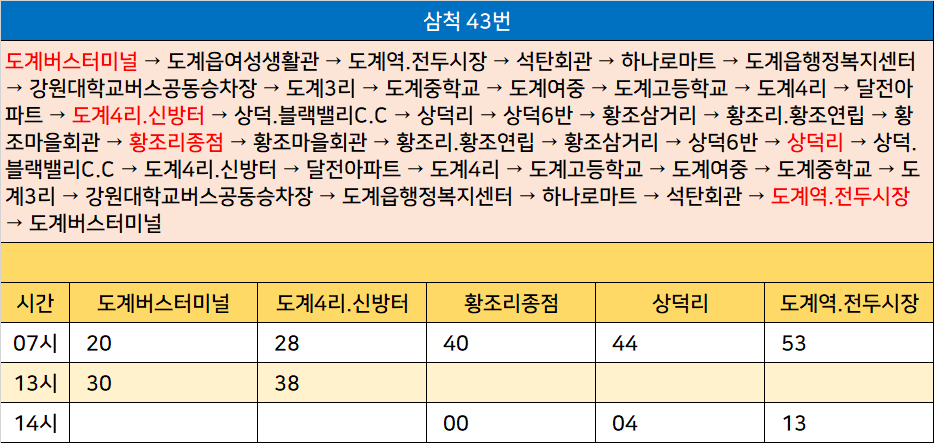 삼척 43번: 도계버스터미널 → 도계읍여성생활관 → 도계역.전두시장 → 석탄회관 → 하나로마트 → 도계읍행정복지센터 → 강원대학교버스공동승차장 → 도계3리 → 도계중학교 → 도계여중 → 도계고등학교 → 도계4리 → 달전아파트 → 도계4리.신방터 → 상덕.블랙밸리C.C → 상덕리 → 상덕6반 → 황조삼거리 → 황조리.황조연립 → 황조마을회관 → 황조리종점 → 황조마을회관 → 황조리.황조연립 → 황조삼거리 → 상덕6반 → 상덕리 → 상덕.블랙밸리C.C → 도계4리.신방터 → 달전아파트 → 도계4리 → 도계고등학교 → 도계여중 → 도계중학교 → 도계3리 → 강원대학교버스공동승차장 → 도계읍행정복지센터 → 하나로마트 → 석탄회관 → 도계역.전두시장 → 도계버스터미널