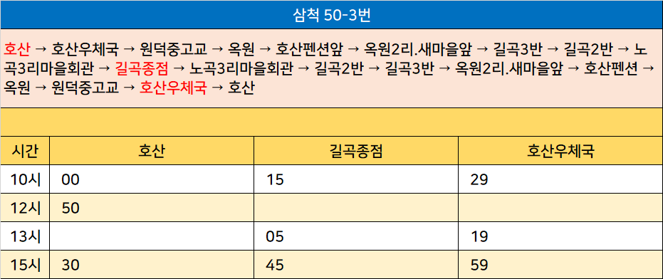 삼척 50-3번: 호산 → 호산우체국 → 원덕중고교 → 옥원 → 호산펜션앞 → 옥원2리.새마을앞 → 길곡3반 → 길곡2반 → 노곡3리마을회관 → 길곡종점 → 노곡3리마을회관 → 길곡2반 → 길곡3반 → 옥원2리.새마을앞 → 호산펜션 → 옥원 → 원덕중고교 → 호산우체국 → 호산
