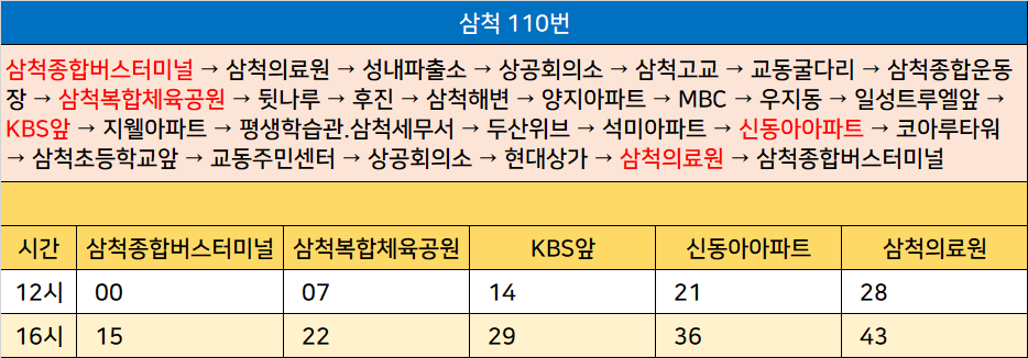 삼척 110번: 삼척종합버스터미널 → 삼척의료원 → 성내파출소 → 상공회의소 → 삼척고교 → 교동굴다리 → 삼척종합운동장 → 삼척복합체육공원 → 뒷나루 → 후진 → 삼척해변 → 양지아파트 → MBC → 우지동 → 일성트루엘앞 → KBS앞 → 지웰아파트 → 평생학습관.삼척세무서 → 두산위브 → 석미아파트 → 신동아아파트 → 코아루타워 → 삼척초등학교앞 → 교동주민센터 → 상공회의소 → 현대상가 → 삼척의료원 → 삼척종합버스터미널