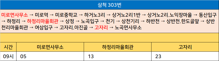 삼척 303번: 미로면사무소 → 미로역 → 미로중학교 → 하거노3리 → 상거노2리1반 → 상거노2리.노익장마을 → 동산입구 → 하정리 → 하정리마을회관 → 상정 → 노곡입구 → 천기 → 상천기리 → 하반천 → 상반천.한도골앞 → 상반천리마을회관 → 여삼입구 → 고자리.아진골 → 고자리 → 노곡면사무소