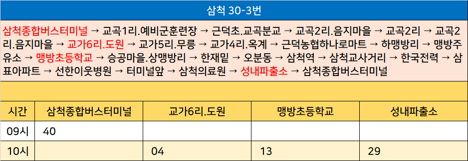 삼척 30-3번: 삼척종합버스터미널 → 교곡1리.예비군훈련장 → 근덕초.교곡분교 → 교곡2리.음지마을 → 교곡2리 → 교곡2리.음지마을 → 교가6리.도원 → 교가5리.무릉 → 교가4리.옥계 → 근덕농협하나로마트 → 하맹방리 → 맹방주유소 → 맹방초등학교 → 승공마을.상맹방리 → 한재밑 → 오분동 → 삼척역 → 삼척교사거리 → 한국전력 → 삼표아파트 → 선한이웃병원 → 터미널앞 → 삼척의료원 → 성내파출소 → 삼척종합버스터미널