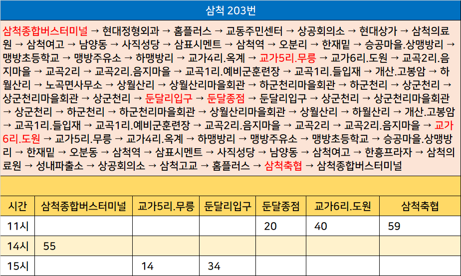 삼척 203번: 삼척종합버스터미널 → 현대정형외과 → 홈플러스 → 교동주민센터 → 상공회의소 → 현대상가 → 삼척의료원 → 삼척여고 → 남양동 → 사직성당 → 삼표시멘트 → 삼척역 → 오분리 → 한재밑 → 승공마을.상맹방리 → 맹방초등학교 → 맹방주유소 → 하맹방리 → 교가4리.옥계 → 교가5리.무릉 → 교가6리.도원 → 교곡2리.음지마을 → 교곡2리 → 교곡2리.음지마을 → 교곡1리.예비군훈련장 → 교곡1리.들입재 → 개산.고봉암 → 하월산리 → 노곡면사무소 → 상월산리 → 상월산리마을회관 → 하군천리마을회관 → 하군천리 → 상군천리 → 상군천리마을회관 → 상군천리 → 둔달리입구 → 둔달종점 → 둔달리입구 → 상군천리 → 상군천리마을회관 → 상군천리 → 하군천리 → 하군천리마을회관 → 상월산리마을회관 → 상월산리 → 하월산리 → 개산.고봉암 → 교곡1리.들입재 → 교곡1리.예비군훈련장 → 교곡2리.음지마을 → 교곡2리 → 교곡2리.음지마을 → 교가6리.도원 → 교가5리.무릉 → 교가4리.옥계 → 하맹방리 → 맹방주유소 → 맹방초등학교 → 승공마을.상맹방리 → 한재밑 → 오분동 → 삼척역 → 삼표시멘트 → 사직성당 → 남양동 → 삼척여고 → 한흥프라자 → 삼척의료원 → 성내파출소 → 상공회의소 → 삼척고교 → 홈플러스 → 삼척축협 → 삼척종합버스터미널