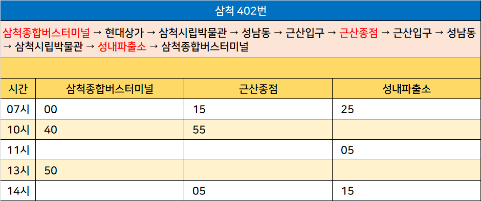 삼척 402번: 삼척종합버스터미널 → 현대상가 → 삼척시립박물관 → 성남동 → 근산입구 → 근산종점 → 근산입구 → 성남동 → 삼척시립박물관 → 성내파출소 → 삼척종합버스터미널