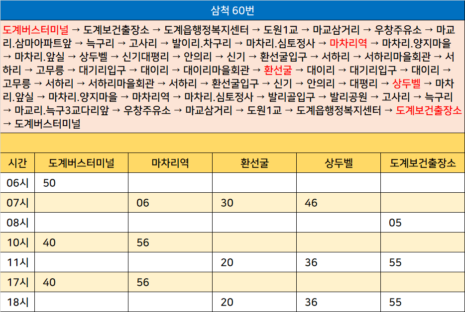 삼척 60번: 도계버스터미널 → 도계보건출장소 → 도계읍행정복지센터 → 도원1교 → 마교삼거리 → 우창주유소 → 마교리.삼마아파트앞 → 늑구리 → 고사리 → 발이리.차구리 → 마차리.심토정사 → 마차리역 → 마차리.양지마을 → 마차리.앞실 → 상두벨 → 신기대평리 → 안의리 → 신기 → 환선굴입구 → 서하리 → 서하리마을회관 → 서하리 → 고무릉 → 대기리입구 → 대이리 → 대이리마을회관 → 환선굴 → 대이리 → 대기리입구 → 대이리 → 고무릉 → 서하리 → 서하리마을회관 → 서하리 → 환선굴입구 → 신기 → 안의리 → 대평리 → 상두벨 → 마차리.앞실 → 마차리.양지마을 → 마차리역 → 마차리.심토정사 → 발리골입구 → 발리공원 → 고사리 → 늑구리 → 마교리.늑구3교다리앞 → 우창주유소 → 마교삼거리 → 도원1교 → 도계읍행정복지센터 → 도계보건출장소 → 도계버스터미널