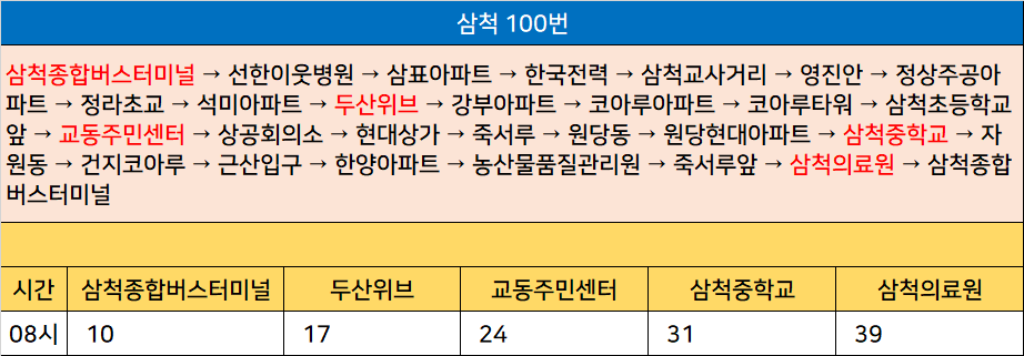 삼척 100번: 삼척종합버스터미널 → 선한이웃병원 → 삼표아파트 → 한국전력 → 삼척교사거리 → 영진안 → 정상주공아파트 → 정라초교 → 석미아파트 → 두산위브 → 강부아파트 → 코아루아파트 → 코아루타워 → 삼척초등학교앞 → 교동주민센터 → 상공회의소 → 현대상가 → 죽서루 → 원당동 → 원당현대아파트 → 삼척중학교 → 자원동 → 건지코아루 → 근산입구 → 한양아파트 → 농산물품질관리원 → 죽서루앞 → 삼척의료원 → 삼척종합버스터미널