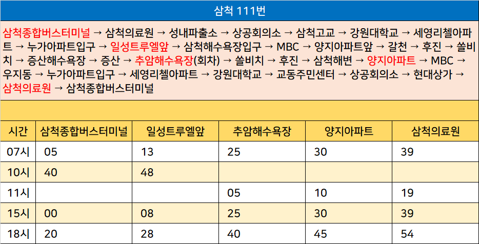 삼척 111번: 삼척종합버스터미널 → 삼척의료원 → 성내파출소 → 상공회의소 → 삼척고교 → 강원대학교 → 세영리첼아파트 → 누가아파트입구 → 일성트루엘앞 → 삼척해수욕장입구 → MBC → 양지아파트앞 → 갈천 → 후진 → 쏠비치 → 증산해수욕장 → 증산 → 추암해수욕장(회차) → 쏠비치 → 후진 → 삼척해변 → 양지아파트 → MBC → 우지동 → 누가아파트입구 → 세영리첼아파트 → 강원대학교 → 교동주민센터 → 상공회의소 → 현대상가 → 삼척의료원 → 삼척종합버스터미널