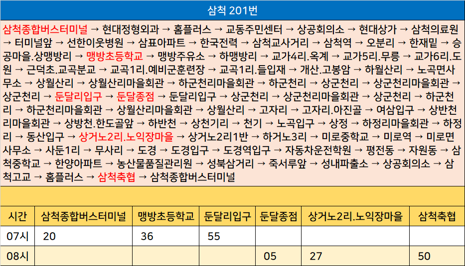 삼척 201번: 삼척종합버스터미널 → 현대정형외과 → 홈플러스 → 교동주민센터 → 상공회의소 → 현대상가 → 삼척의료원 → 터미널앞 → 선한이웃병원 → 삼표아파트 → 한국전력 → 삼척교사거리 → 삼척역 → 오분리 → 한재밑 → 승공마을.상맹방리 → 맹방초등학교 → 맹방주유소 → 하맹방리 → 교가4리.옥계 → 교가5리.무릉 → 교가6리.도원 → 근덕초.교곡분교 → 교곡1리.예비군훈련장 → 교곡1리.들입재 → 개산.고봉암 → 하월산리 → 노곡면사무소 → 상월산리 → 상월산리마을회관 → 하군천리마을회관 → 하군천리 → 상군천리 → 상군천리마을회관 → 상군천리 → 둔달리입구 → 둔달종점 → 둔달리입구 → 상군천리 → 상군천리마을회관 → 상군천리 → 하군천리 → 하군천리마을회관 → 상월산리마을회관 → 상월산리 → 고자리 → 고자리.아진골 → 여삼입구 → 상반천리마을회관 → 상방천.한도골앞 → 하반천 → 상천기리 → 천기 → 노곡입구 → 상정 → 하정리마을회관 → 하정리 → 동산입구 → 상거노2리.노익장마을 → 상거노2리1반 → 하거노3리 → 미로중학교 → 미로역 → 미로면사무소 → 사둔1리 → 무사리 → 도경 → 도경입구 → 도경역입구 → 자동차운전학원 → 평전동 → 자원동 → 삼척중학교 → 한양아파트 → 농산물품질관리원 → 성북삼거리 → 죽서루앞 → 성내파출소 → 상공회의소 → 삼척고교 → 홈플러스 → 삼척축협 → 삼척종합버스터미널