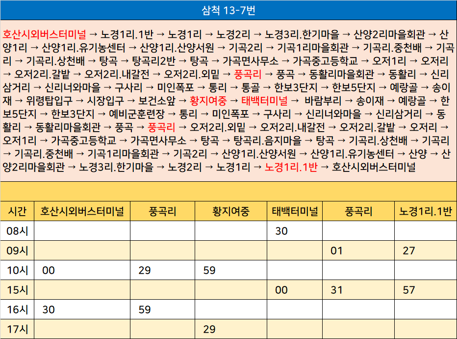 삼척 13-7번: 호산시외버스터미널 → 노경1리.1반 → 노경1리 → 노경2리 → 노경3리.한기마을 → 산양2리마을회관 → 산양1리 → 산양1리.유기농센터 → 산양1리.산양서원 → 기곡2리 → 기곡1리마을회관 → 기곡리.중천배 → 기곡리 → 기곡리.상천배 → 탕곡 → 탕곡리2반 → 탕곡 → 가곡면사무소 → 가곡중고등학교 → 오저1리 → 오저리 → 오저2리.갈밭 → 오저2리.내갈전 → 오저2리.외밑 → 풍곡리 → 풍곡 → 동활리마을회관 → 동활리 → 신리삼거리 → 신리너와마을 → 구사리 → 미인폭포 → 통리 → 통골 → 한보3단지 → 한보5단지 → 예랑골 → 송이재 → 위령탑입구 → 시장입구 → 보건소앞 → 황지여중 → 태백터미널 → 바람부리 → 송이재 → 예랑골 → 한보5단지 → 한보3단지 → 예비군훈련장 → 통리 → 미인폭포 → 구사리 → 신리너와마을 → 신리삼거리 → 동활리 → 동활리마을회관 → 풍곡 → 풍곡리 → 오저2리.외밑 → 오저2리.내갈전 → 오저2리.갈밭 → 오저리 → 오저1리 → 가곡중고등학교 → 가곡면사무소 → 탕곡 → 탕곡리.음지마을 → 탕곡 → 기곡리.상천배 → 기곡리 → 기곡리.중천배 → 기곡1리마을회관 → 기곡2리 → 산양1리.산양서원 → 산양1리.유기농센터 → 산양 → 산양2리마을회관 → 노경3리.한기마을 → 노경2리 → 노경1리 → 노경1리.1반 → 호산시외버스터미널