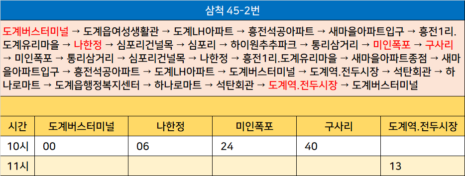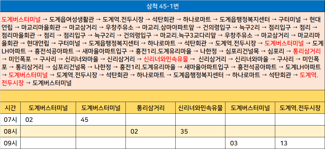 삼척 45-1번: 도계버스터미널 → 도계읍여성생활관 → 도계역.전두시장 → 석탄회관 → 하나로마트 → 도계읍행정복지센터 → 구터미널 → 현대연립 → 마교리마을회관 → 마교삼거리 → 우창주유소 → 마교리.삼마아파트앞 → 건의령입구 → 늑구2리 → 점리입구 → 점리 → 점리마을회관 → 점리 → 점리입구 → 늑구2리 → 건의령입구 → 마교리.늑구3교다리앞 → 우창주유소 → 마교삼거리 → 마교리마을회관 → 현대연립 → 구터미널 → 도계읍행정복지센터 → 하나로마트 → 석탄회관 → 도계역.전두시장 → 도계버스터미널 → 도계LH아파트 → 흥전석공아파트 → 새마을아파트입구 → 흥전1리.도계유리마을 → 나한정 → 심포리건널목 → 심포리 → 통리삼거리 → 미인폭포 → 구사리 → 신리너와마을 → 신리삼거리 → 신리너와민속유물 → 신리삼거리 → 신리너와마을 → 구사리 → 미인폭포 → 통리삼거리 → 심포리건널목 → 나한정 → 흥전1리.도계유리마을 → 새마을아파트입구 → 흥전석공아파트 → 도계LH아파트 → 도계버스터미널 → 도계역.전두시장 → 석탄회관 → 하나로마트 → 도계읍행정복지센터 → 하나로마트 → 석탄회관 → 도계역.전두시장 → 도계버스터미널